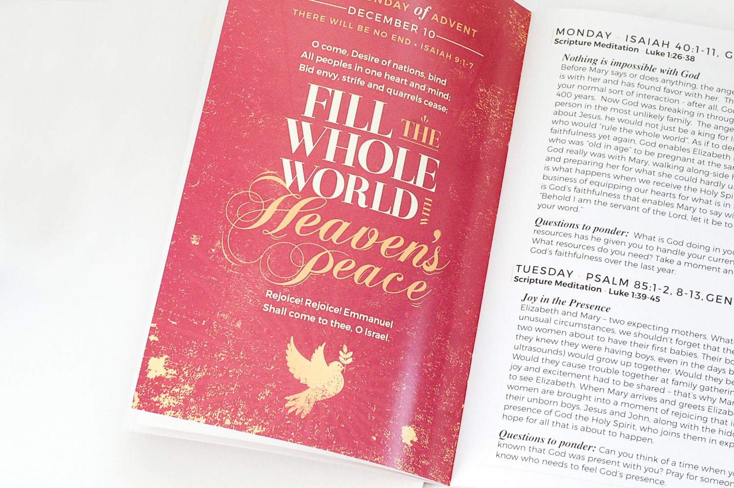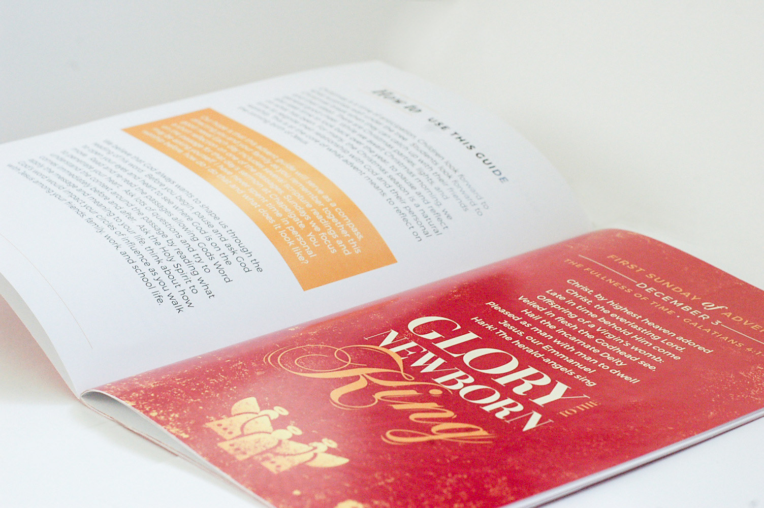 This booklet was part of an Advent series. Every year, the church I worked for presented the congregation with these Advent devotional booklets to lead people through the days leading up to the birth of Jesus. This one had an emphasis on the timeline of Christ's entire story arc; from prophecy to death. These booklets were presented to the congregation of the church to be study guides and the art was used for signage, on the app, and as a landing page for other Christmas related information. The booklet was also translated into Korean.