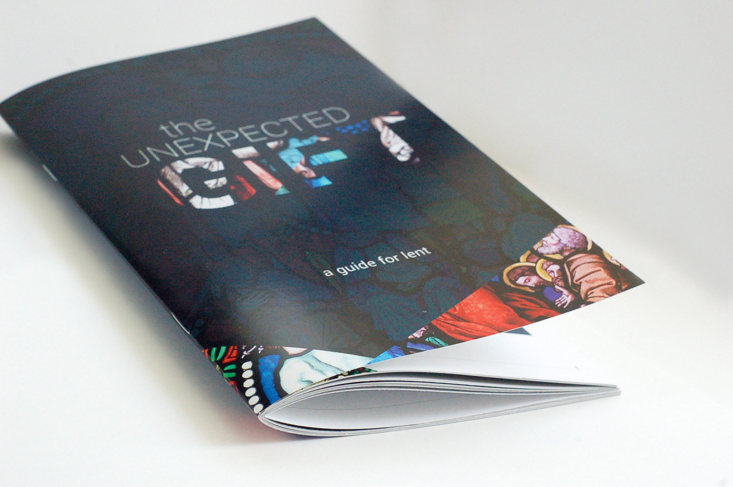 Similarly to the Advent booklets, this one was part of the church's Lent series. I decided to play with art that exudes the feeling of a classic technique used by churches across the world and throughout generations: stained glass. A beautiful, difficult craft that is admirable and timeless, but is ultimately only another outlet with which we reflect the gift of creativity from our Creator. I like the juxtaposition of the simplicity of the gospel message - God sent his son Jesus to save us from our sins - and the ornate and saturated colors of the paintings in this booklet.